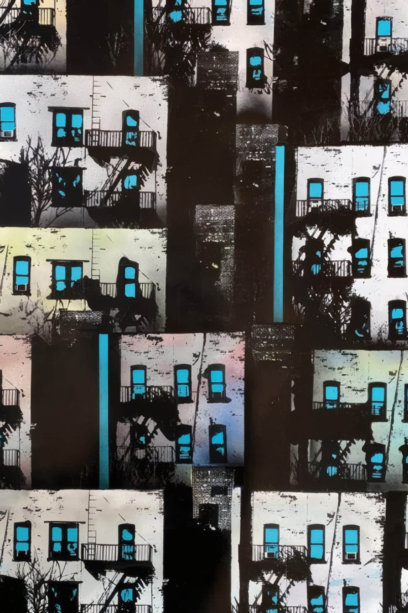 Fernando “Ski” Romero’s Cluster is a 50″ × 31″ mixed media canvas exploring repetition and rhythm in the urban landscape. Windows and fire escapes stack into a near-abstract grid, accented by bold color shifts that highlight order and chaos. Offered unframed; framed options available upon request.